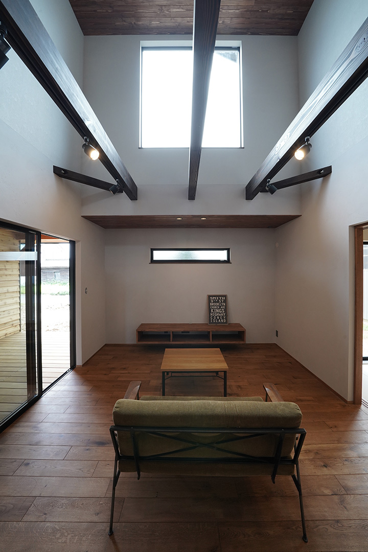 家族が集うLDKは、大きな吹抜けで解放感があり、LDKに面したウッドデッキで内と外の繋がりを作ります。
