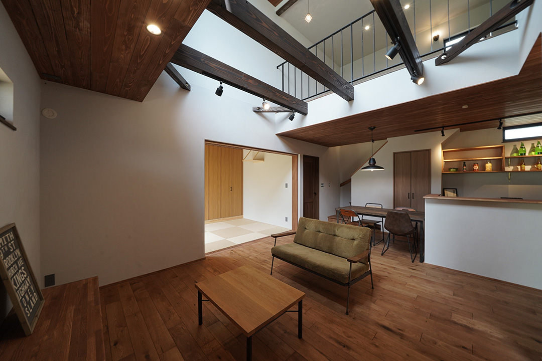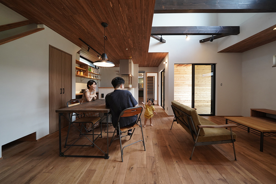 家族が集うLDKは、大きな吹抜けで解放感があり、LDKに面したウッドデッキで内と外の繋がりを作ります。