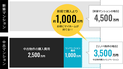 新築マンションや新築⼀⼾建て購⼊と⽐べ、中古+リノベーションをセレクトした場合のメリットをご紹介します。