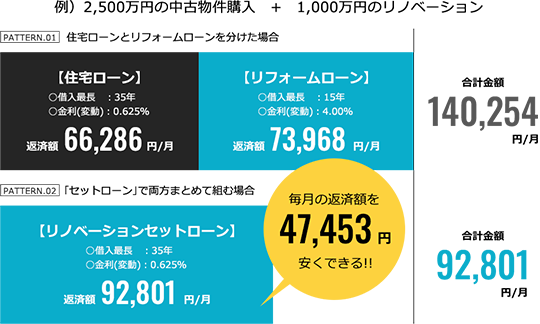 住宅ローンとリフォームローンを分けて組むよりも、物件費⽤とリノベーション費⽤を住宅ローンで⼀本化したほうがお得です。