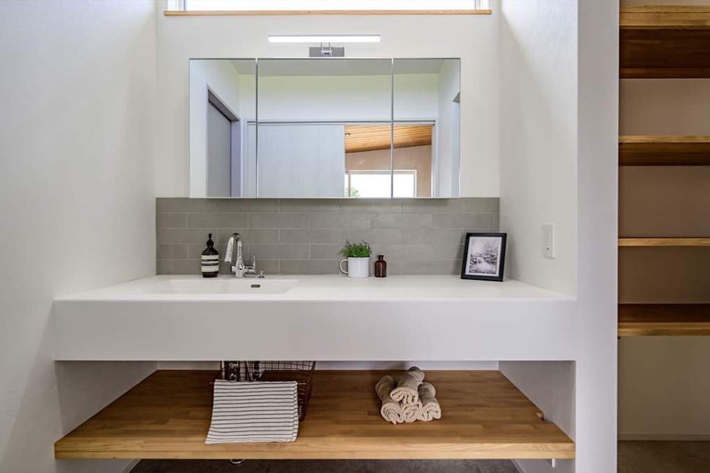 正面のタイルは名古屋モザイクのクールレジン。スモーキーなニュアンスカラーが白基調の洗面に映えますね。
