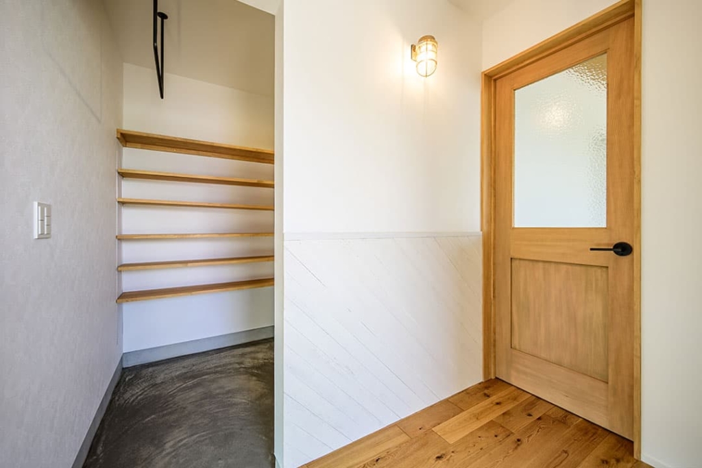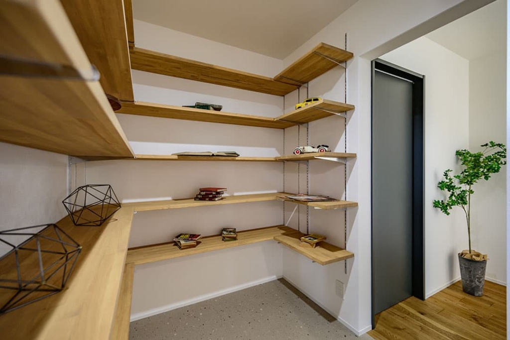 キッチン横のパントリーは多方面から出入りできるので使い勝手も良く、