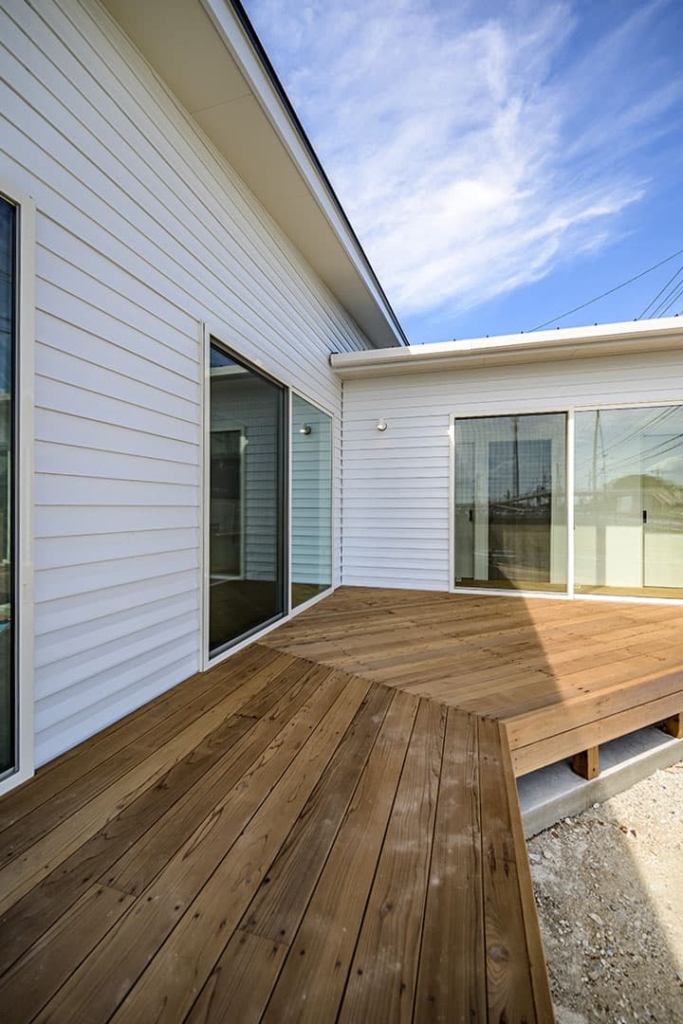 LDKからも寝室の廊下側からも出られる広いウッドデッキ。