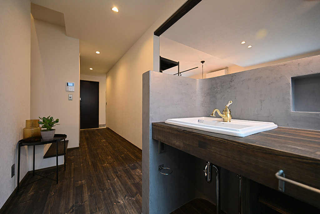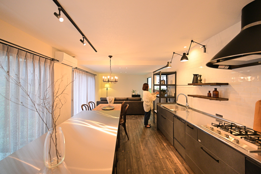 モノクロの清潔感と古材を使用したテーブルを対比的にして木の優しい雰囲気にしました。