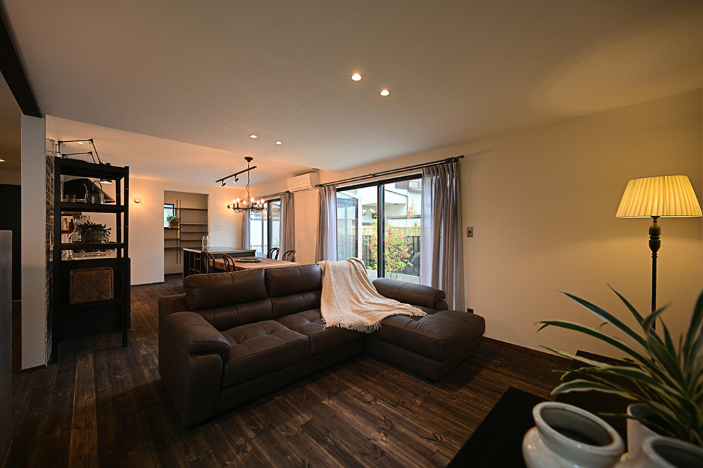 リビングはグレアレスのダウンライトとスタンドライトの柔らかい灯りで