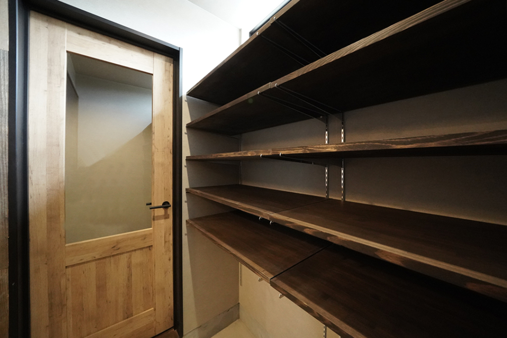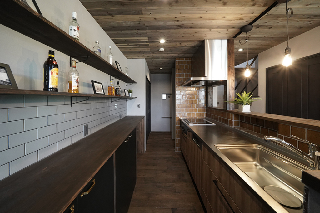 ホロスホームオリジナルのバックカウンターは、扉の色もアクセントでブラックに塗装。