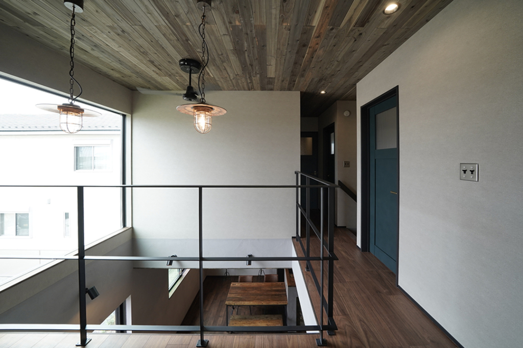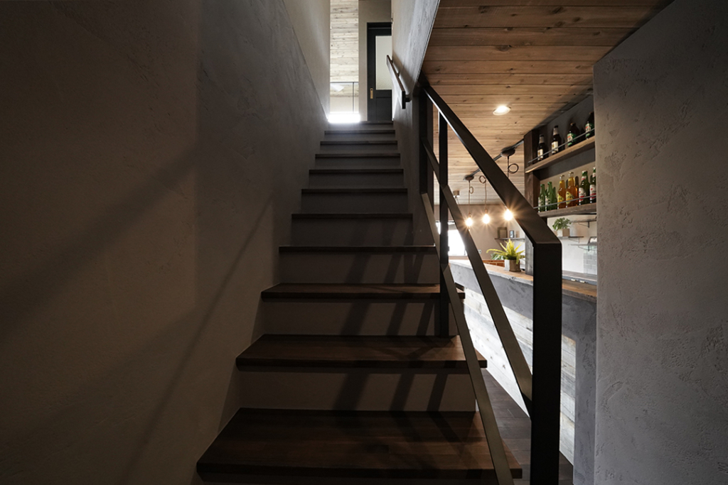 2階に上がる階段はアイアンの手すりを使用し、リビングと繋がる開放感を。