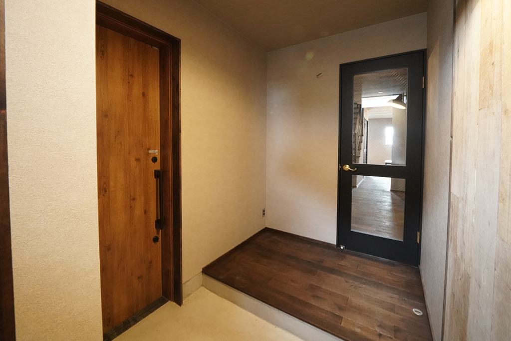 玄関からリビングに繋がる扉には輸入の建具を使用。