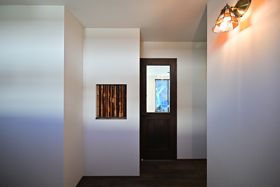 竹をはめ込んだ玄関ニッチと、ステンドグラスのような照明が和風かつレトロな印象を生み出します。