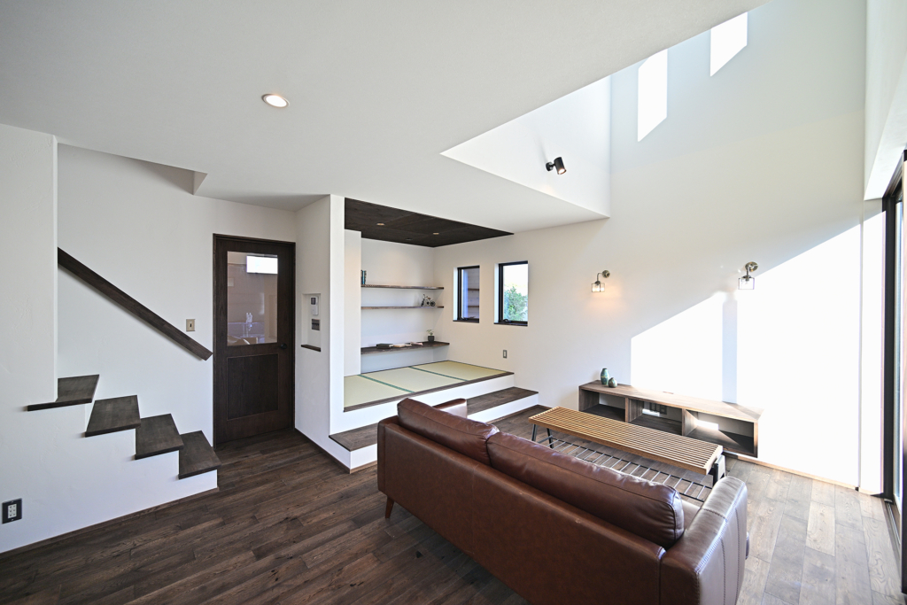 リビングの天井は吹き抜けになっていて、開放的な空間となっています。