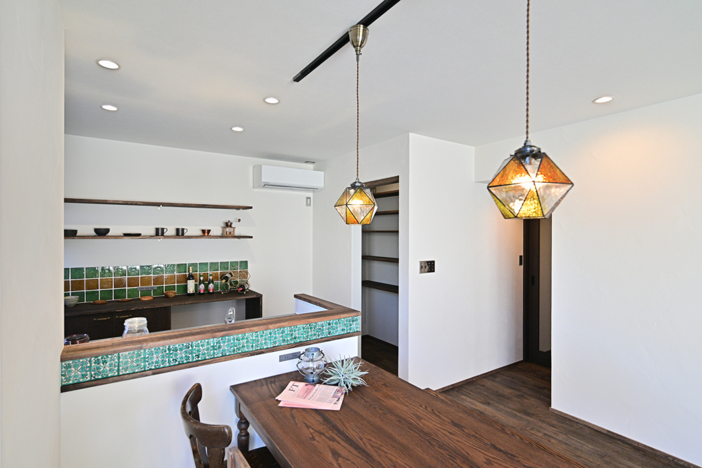 カウンターの上にはグリーンとブラウンのタイルを貼ってアクセントに。