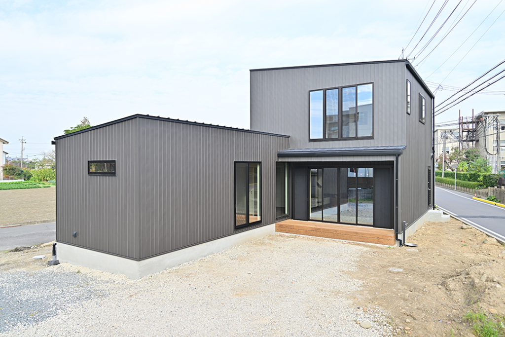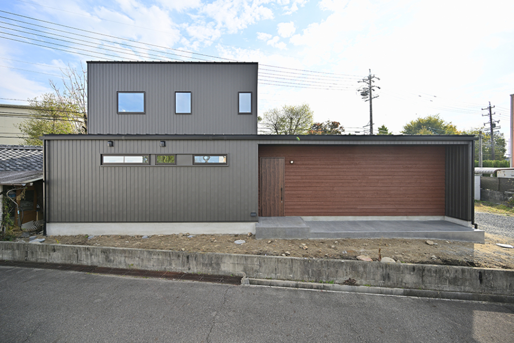 いぶし銀のガルバリウムは日の当たり方で、ブラックにもシルバーにも見えるお色です。