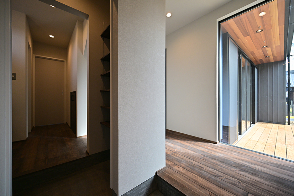 奥のウッドデッキと繋がっているような印象を与え、広がりのある空間を演出しました。