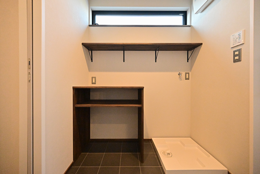 脱衣室のカウンターは洗濯かごと無印良品の引き出しケースが入れられるように計算して製作しました。