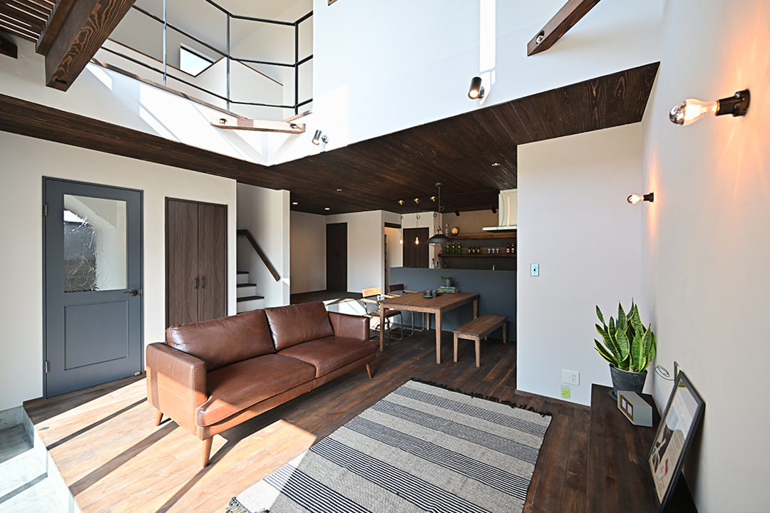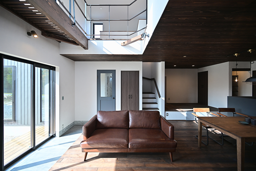 庭に繋がる土間とウッドデッキが部屋を広く見せてくれ、天井は吹き抜けで開放的な空間に。