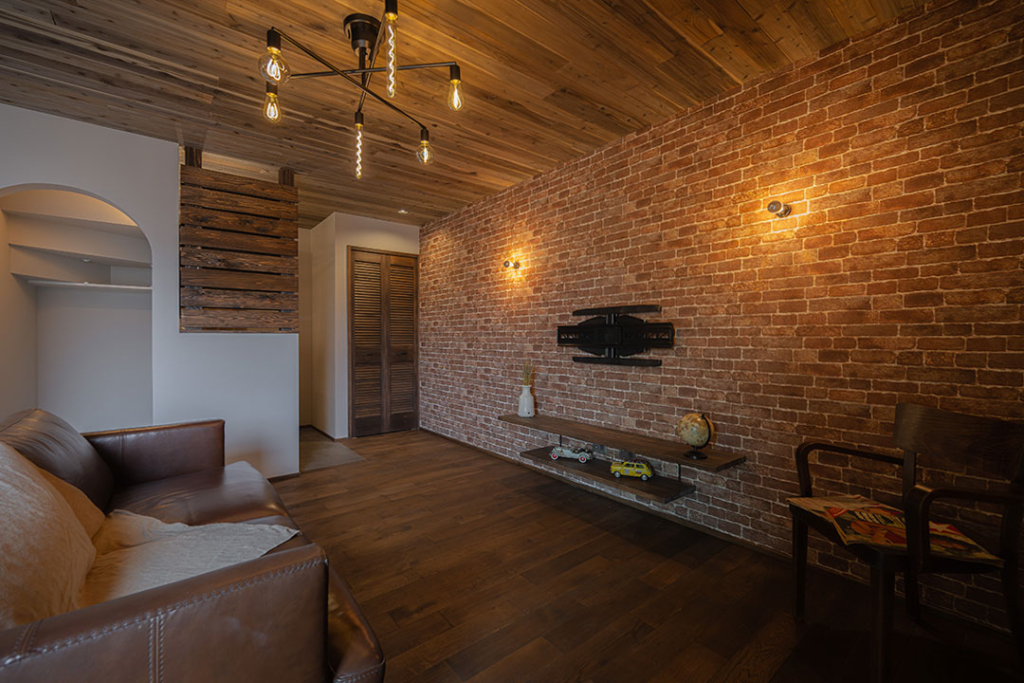 テレビボード背面の壁は、レンガ調のアクセントクロス。