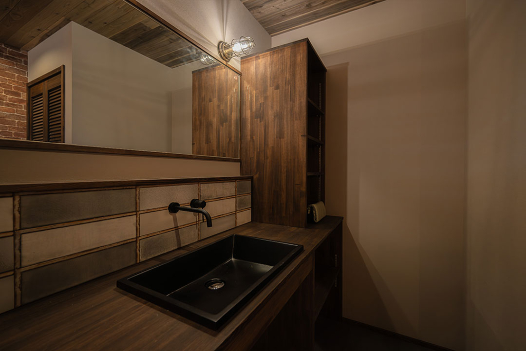ヴィンテージな色合いのタイルに、黒の洗面ボウルでクールな雰囲気の洗面コーナー。