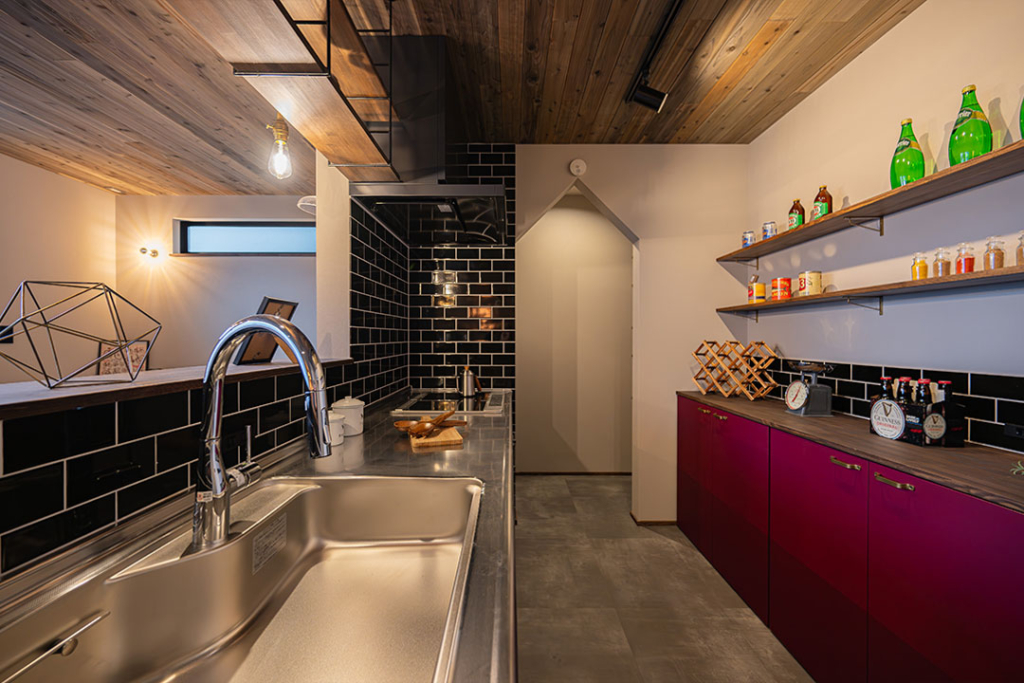 扉はアクセントカラーにワインレッドで塗装。黒のタイルとも合いますね。