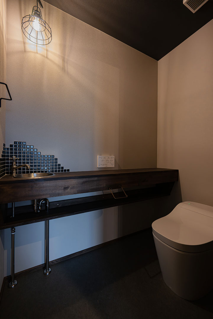水栓やタオルハンガーをシルバーで統一し、手洗いの周りには黒のモザイクタイルをランダム貼りに。