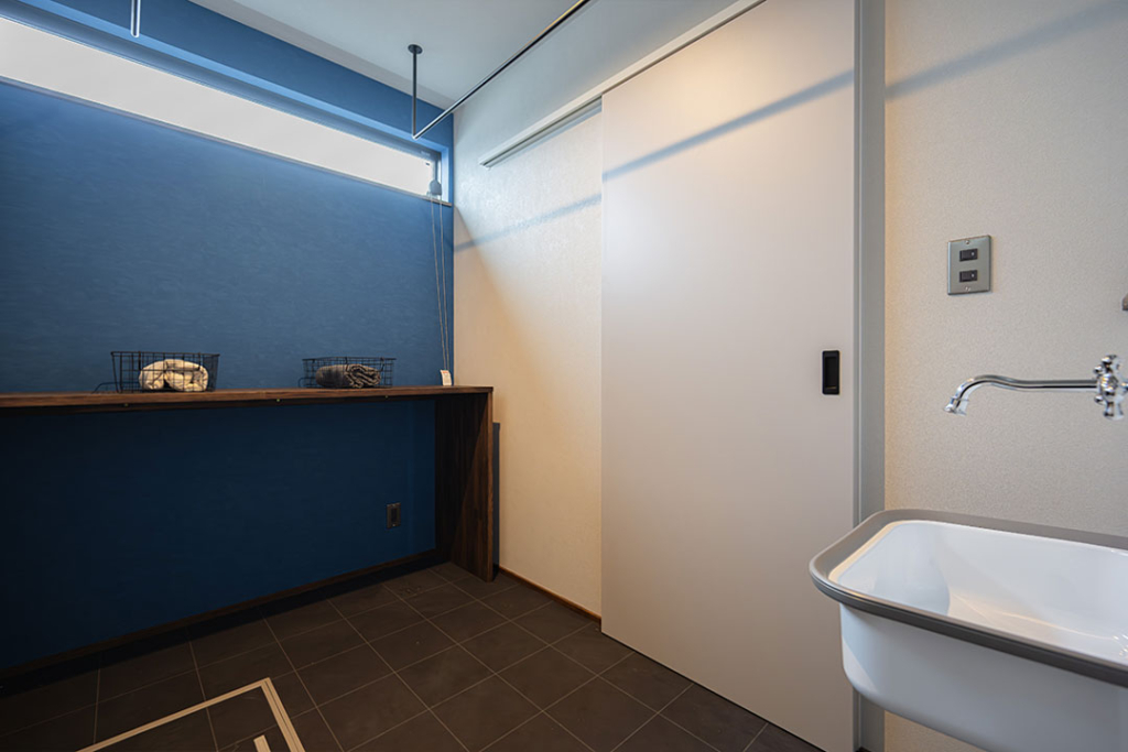 真っ青なアクセントクロスと、お施主様ご用意の輸入多目的ボウルがこだわりポイント。
