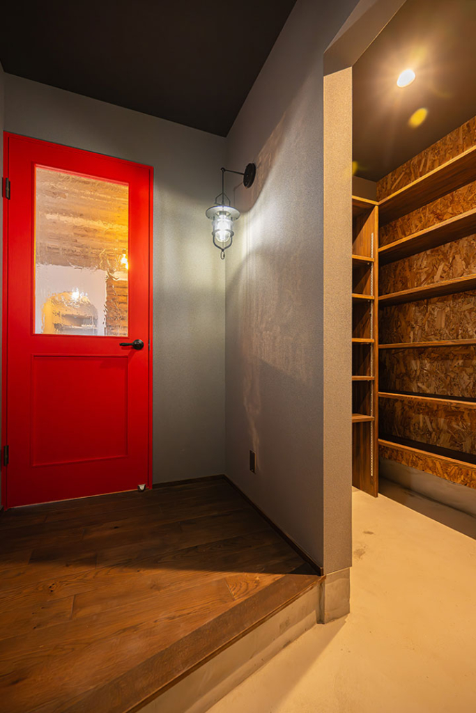 玄関とLDKを繋ぐ赤い輸入ドアがアクセントとなっています。