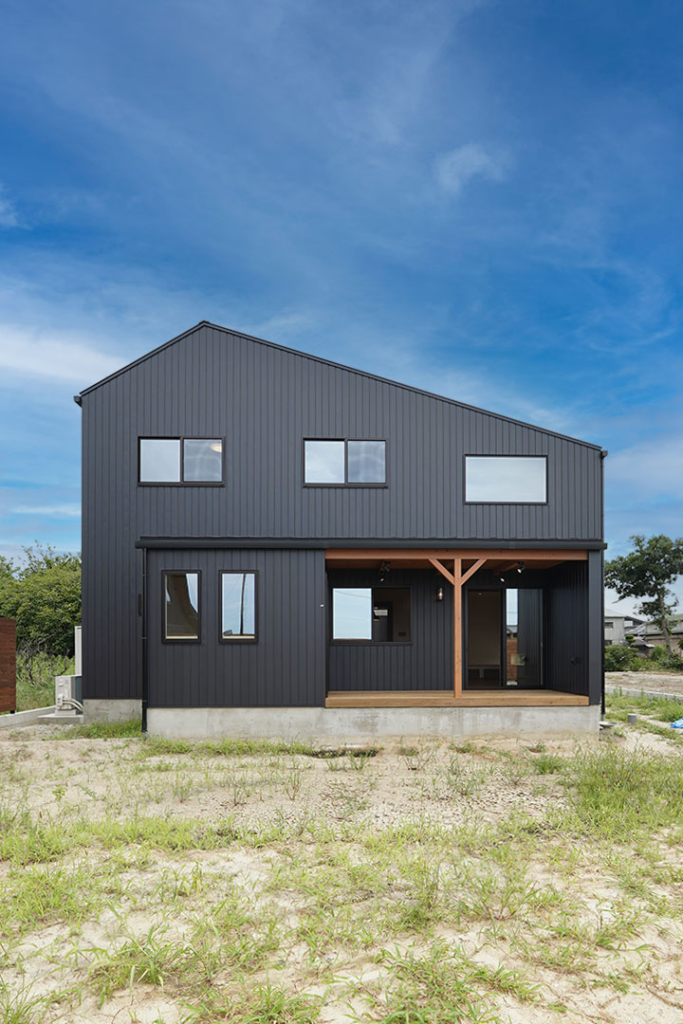 黒のガルバリウムを使った、屋根の形が特徴的な外観。