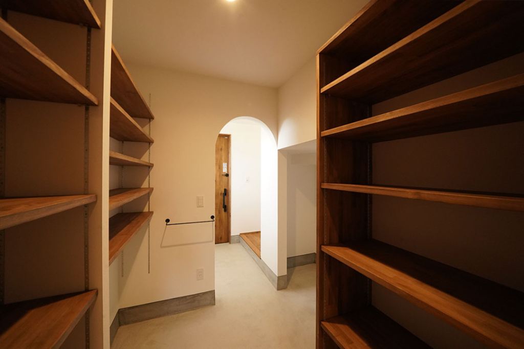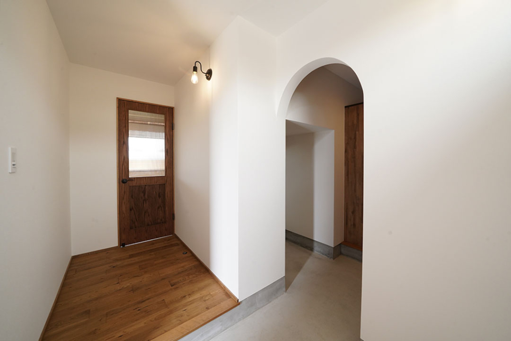 玄関を入ると、土間収納へ続くR垂れ壁の出入り口