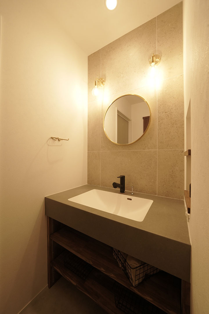 背面はタイル張り、ミラーはラウンドの一面鏡にしました。