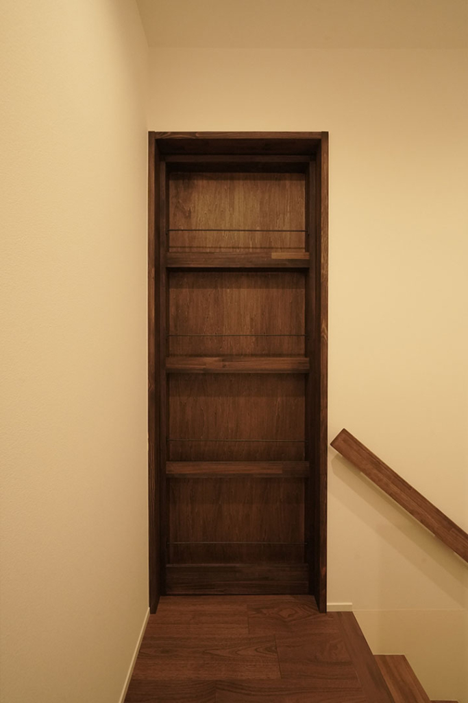 造作の本棚型隠し扉は、間取りの打ち合わせ段階からこだわって造りました。