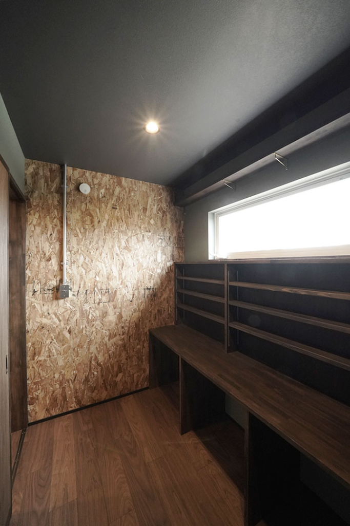 OSB合板のアクセントや鉄管スイッチなど、かっこいい空間を目指しました。