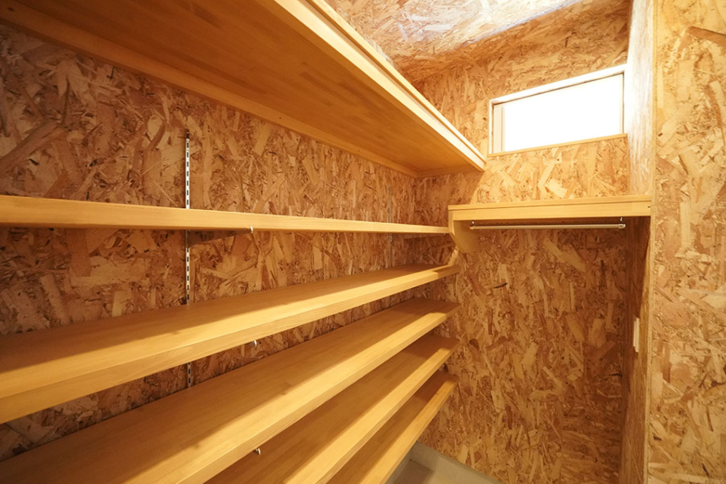 大容量のシューズクローク。ご主人様のご意向で、OSB合板を使用し無骨感を出しました。