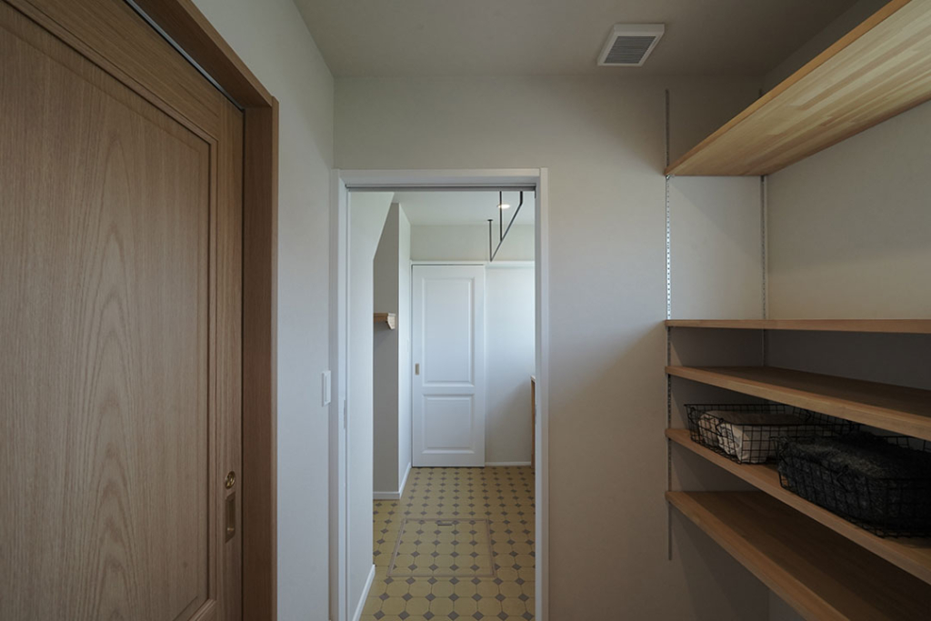 脱衣所からはランドリールームへとつながる家事動線。