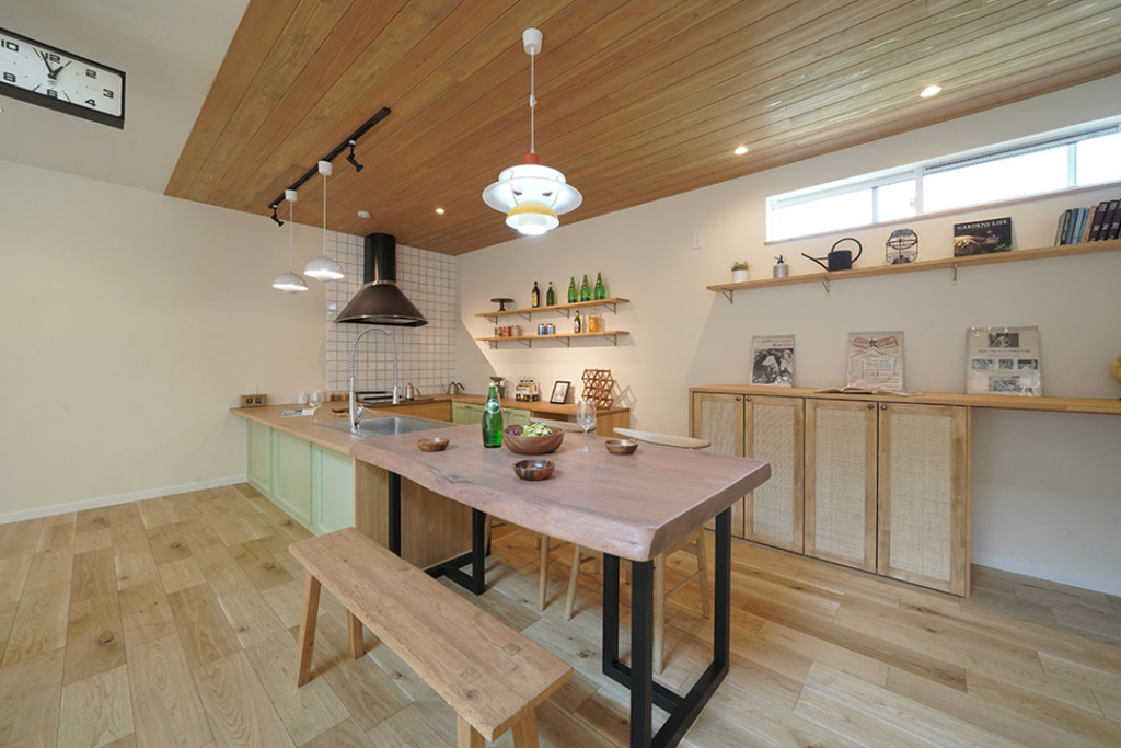 存在感のあるダイニングテーブルは、お施主様が購入した天板をホロスホームの家具職人が加工したオリジナル品。