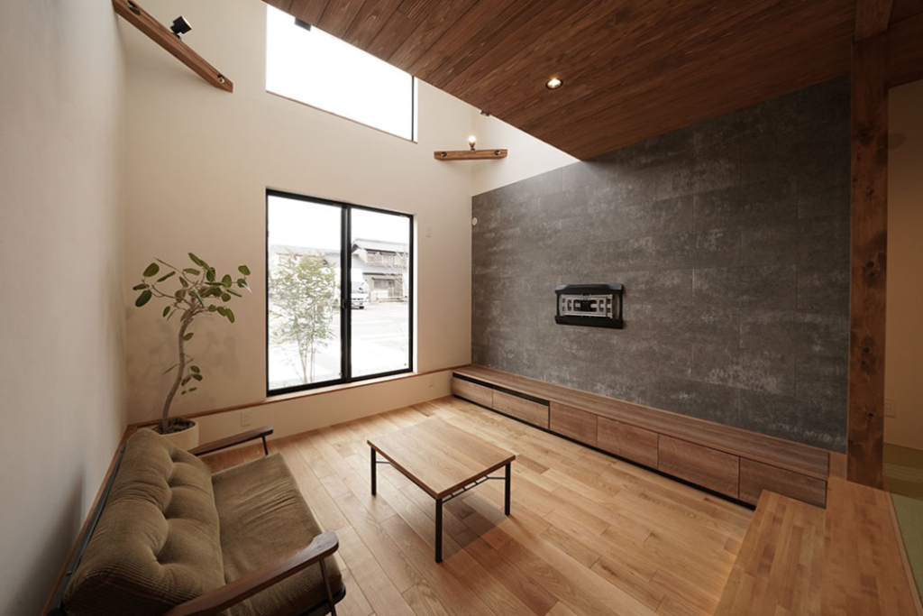 テレビの背面の壁は、KMEWのSOLIDでアクセントに。