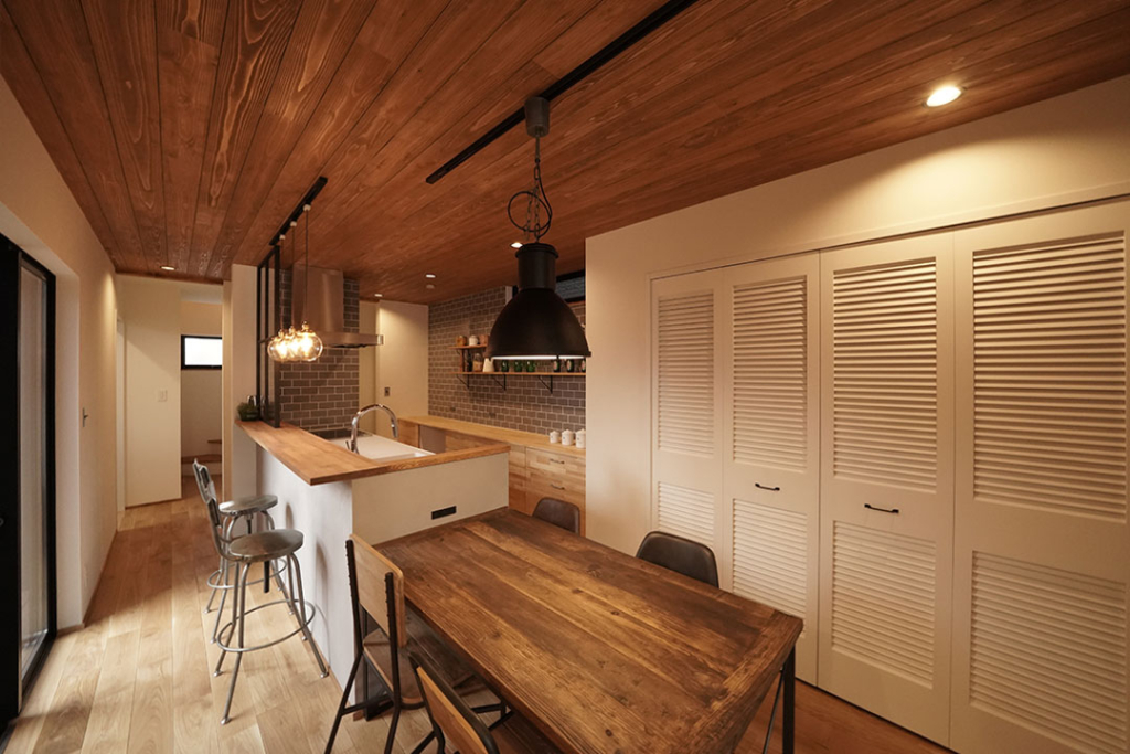 ダイニングの大容量の収納にはルーバードアを設置。
