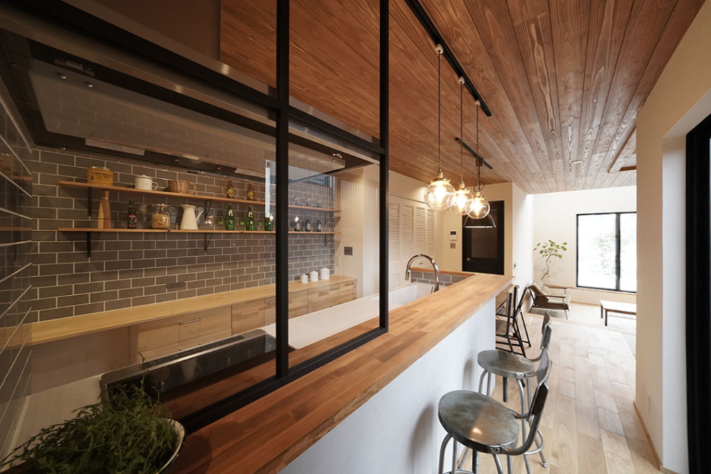 カウンターテーブルのコンロ前には、オリジナルの油跳ねガラスを設置。