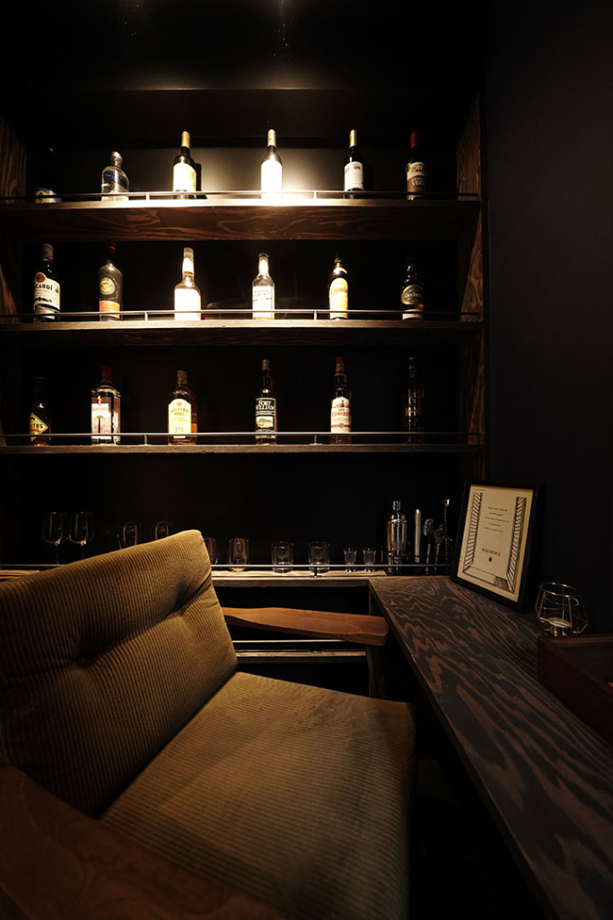 ブラックの壁紙と、古代色で塗装したオリジナルの棚やカウンターテーブルがカッコいいです。