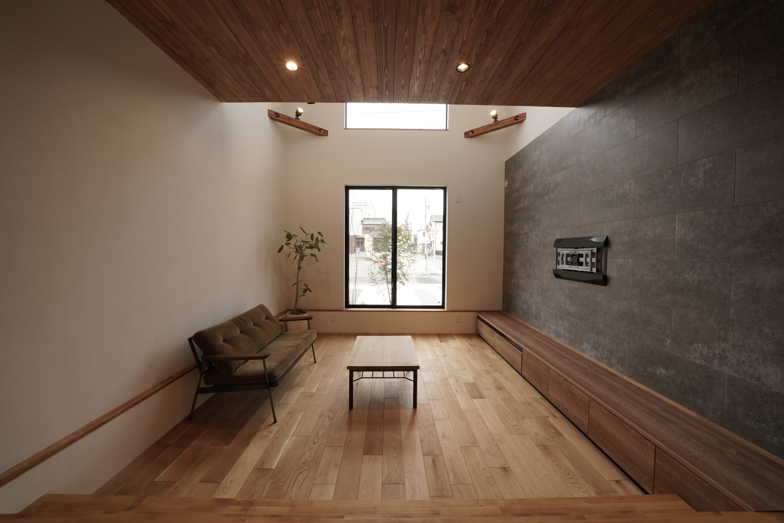テレビの背面の壁は、KMEWのSOLIDでアクセントに。