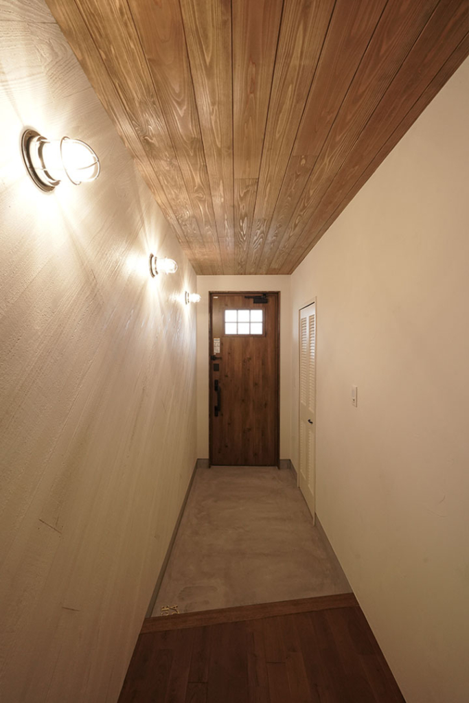 ムラ塗り仕上げの杉板を斜め貼りした壁がアクセントの玄関。
