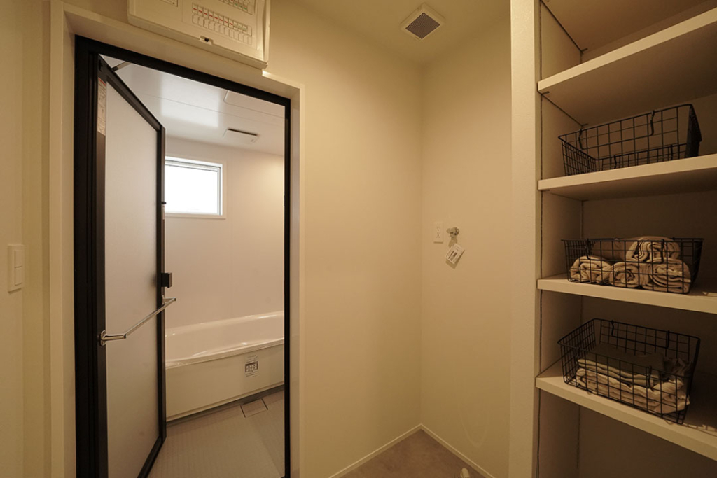 タオルやストック品などもしっかりしまえる可動棚を設置。
