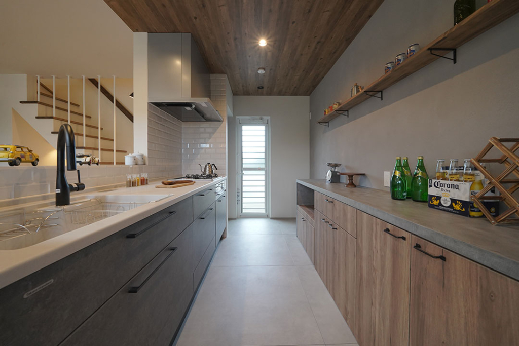 キッチン。水跳ね、油跳ねが気になる部分にはタイルを使用することで、デザイン性と機能性を両立。