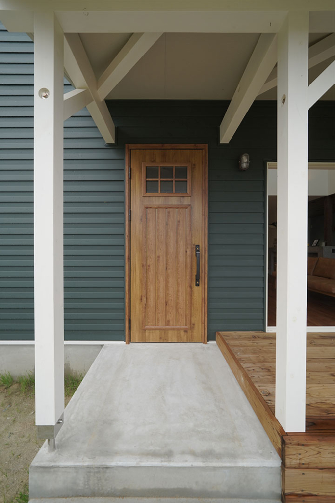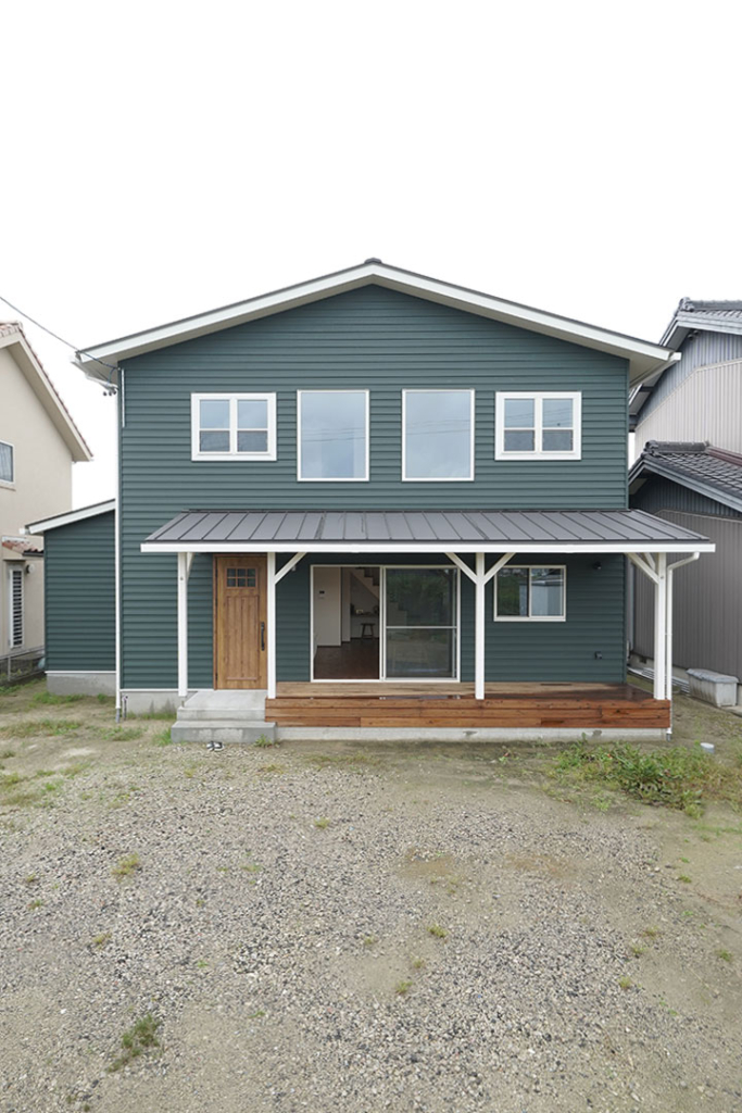 モスグリーンの外壁と柱や梁に使われたホワイトが爽やかな印象に。