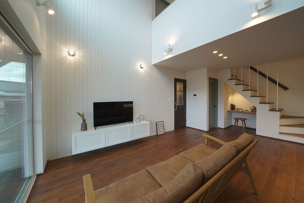 テレビ背面の壁はプレイリーホームズのキーレという板材を吹き抜けの上まで貼って、