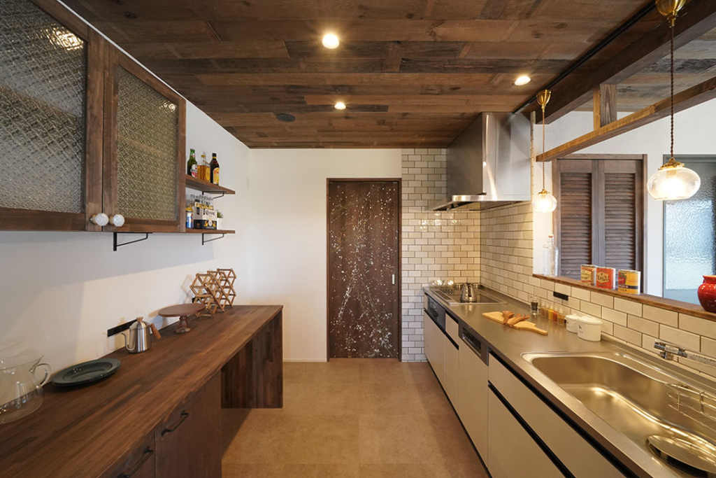 造作の吊り戸棚にはフローラガラスを用いてレトロな雰囲気に。