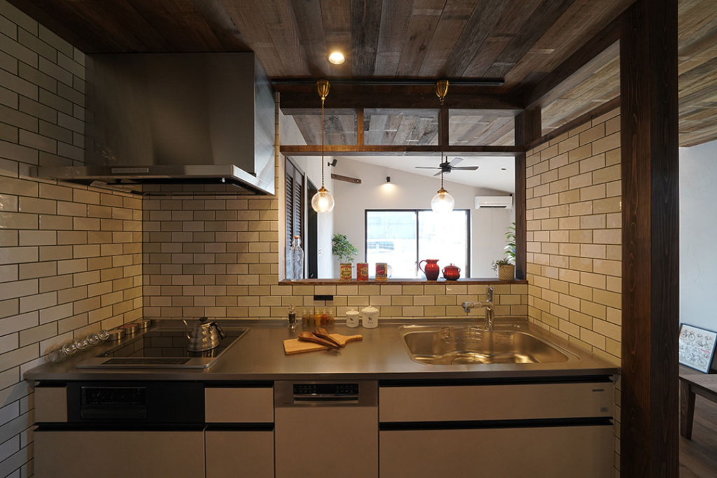 キッチン内側は絶妙な配色で構成された名古屋モザイクのタイル。
