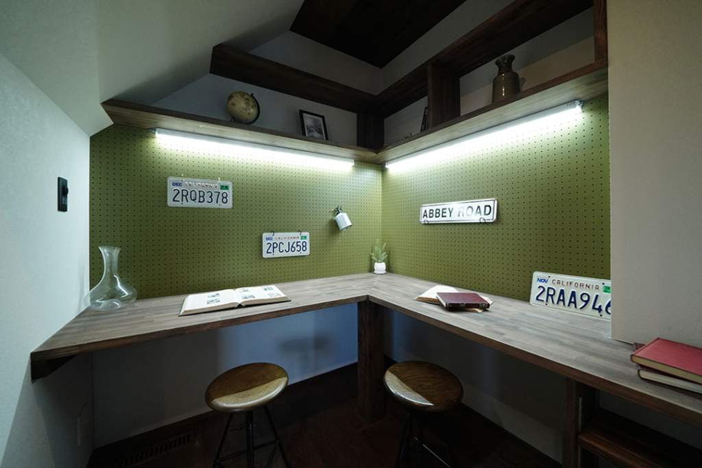 棚下の間接照明は電球色~昼白色まで調節でき、しっかり作業したい時は昼白色で、