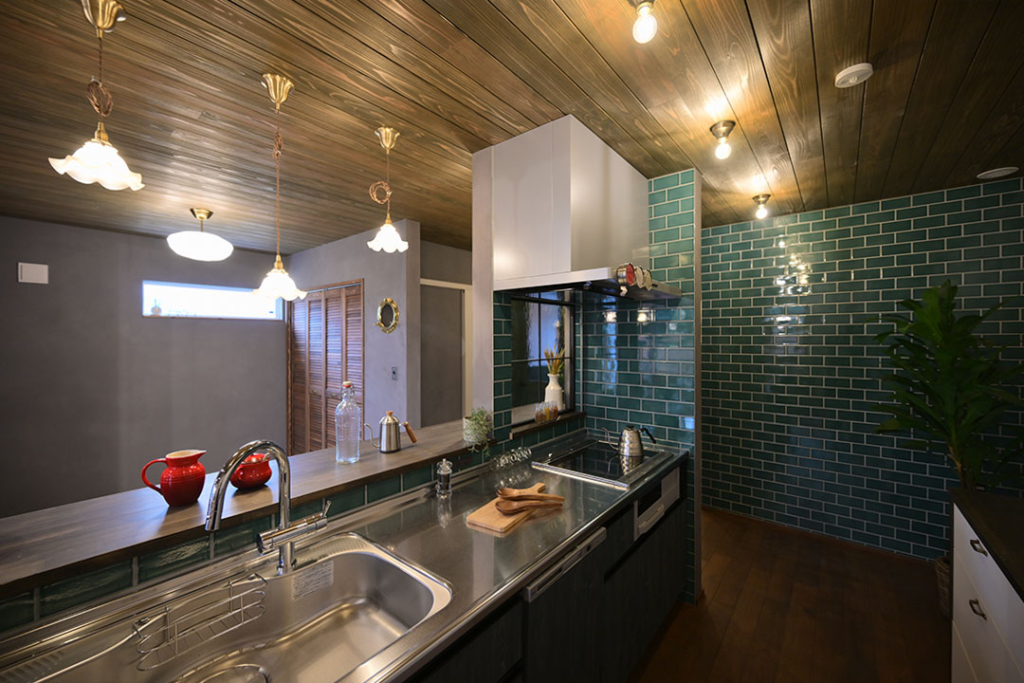 カウンター高さもタイル合わせでスッキリとしたキッチンに。