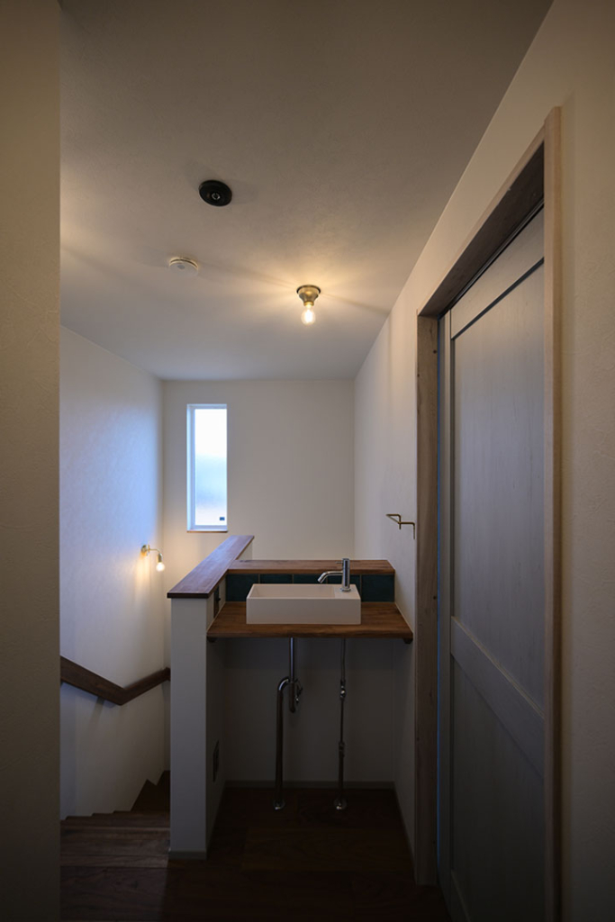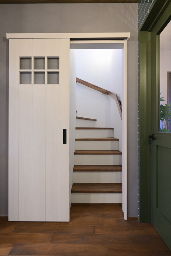 二階へと続く扉は、玄関扉とデザインを合わせてあります。