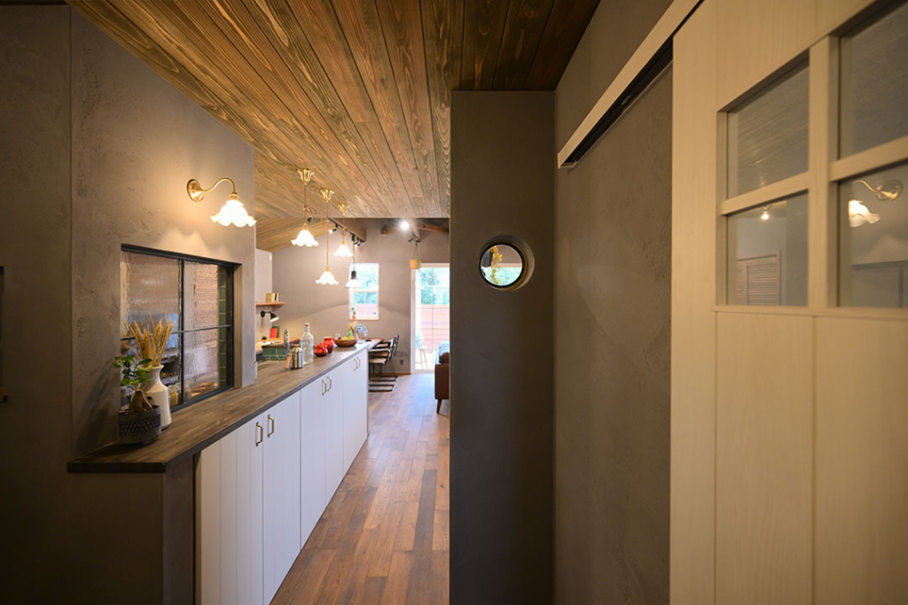 内外を繋ぐモスグリーン腰板張り。SCL間仕切りは、アーチ垂れ壁+腰板高さ合わせウエスタン扉。