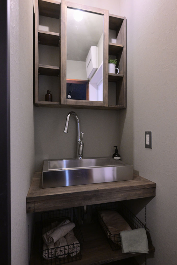 ・キッチンと水回りをつなぐ扉はハーレーのオレンジでカッコよく